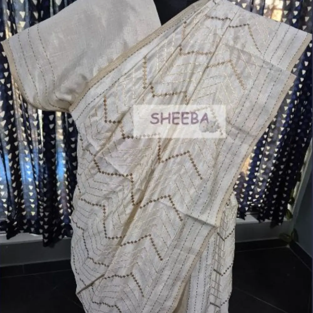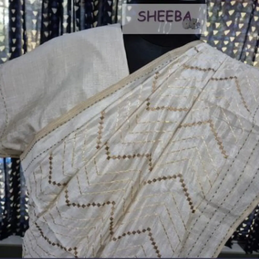 Sunayna Tusser Kantha Work Silk Saree – Motia with Blouse Piece